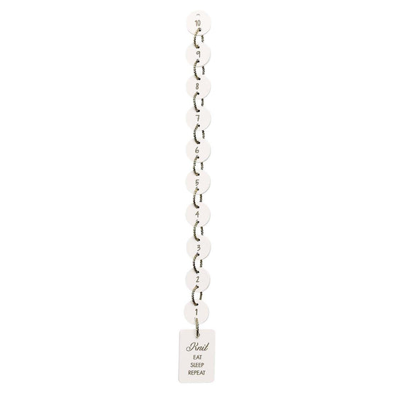 Licznik dziewiarski jest wykonany z drewna i metalu i jest niezwykle lekki, dzięki czemu nie obciąża drutów. Na końcu łańcuszka znajdziesz mantrę: Knit, Eat, Sleep, Repeat.