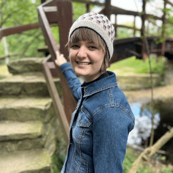 Ta nowoczesna czapka jest przerabiana na okrągło od dołu do góry, zaczyna się od nabrania oczek włóczką w kontrastowym kolorze, a następnie przerabia się brzeg pojedynczym ściegiem ściągaczowym w głównym kolorze. Trójkolorowy geometryczny wzór jest w całości wykonany ściegiem dżersejowym i składa się z naprzemiennie ułożonych kolorowych prostokątnych bloków z prawym górnym rogiem każdego bloku w ciemniejszym kolorze. Resztę czapki przerabia się ściegiem dżersejowym w głównym kolorze, odejmując oczka pochylone na prawo w każdym okrążeniu. Na zdjęciu rozmiar L. Czapka Tipsy dostępna jest w zestawie z pasującym do niej kominem Tipsy.